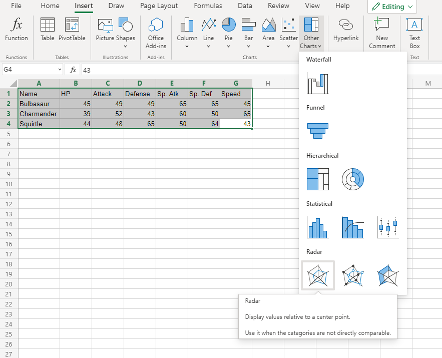 1. Click on the Insert menu, then click on the Other Charts menu () and choose Radar () from the drop-down menu