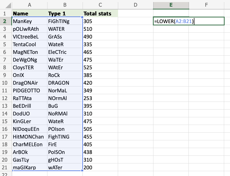 =LOWER(start cell:end cell)